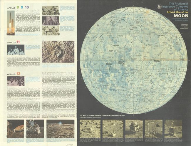 Issued by Rand McNally & Co. as a promotional item for Prudential Insurance Company, this fun space map was published in the lead up to the Apollo 13 mission. The solar system map on recto features a distance chart for radar and radio communications, a space ship time schedule showing how long it would take for a space ship to arrive at various destinations in the Milky Way, and vignettes depicting the Big Bang Theory, asteroids, and views of the different planets. It was originally published separately in 1958. The moon map on verso, dated 1970, shows the landing sites of Apollo 11 and 12, and the proposed landing site of Apollo 13. Black & white photographs along the bottom of the map show the Apollo Lunar Surface Experiments Package (ALSEP). Text to the left of the map describes the various Apollo missions.
