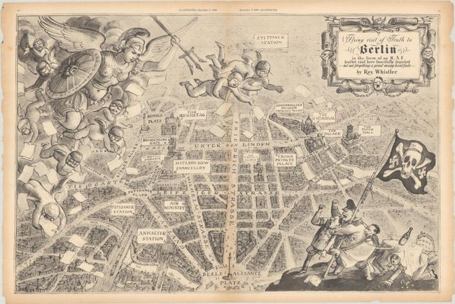Published on 9 December 1939, this wartime cartoon commemorates the first Royal Air Force (RAF) leaflet raid that was conducted on Berlin in October 1939. The RAF was not authorized to bomb civilian areas until after the German fire-bombing of Rotterdam in May 1940, and instead dropped propaganda leaflets. On 1 October 1939, four Whitley Bombers from the No. 10 Squadron became the first British aircraft to fly over Berlin during wartime. Their feat was heralded by the British and were seen as a sign of Germany's inferior air defenses and Berlin's vulnerability to attack. Drawn by Rex Whistler from a bomber's perspective, this cartoon is centered on Friedrichstrasse in Berlin and shows the angels of the RAF led by Britannia releasing leaflets over the city. In the opposing corner, Hitler, Goebbels and Goering support a battered Nazi flag and shake their fists at the angels, while Von Ribbentrop hides under a table. The Nazi flag is actually made from a Jolly Roger flag sporting an SS hat, making it more comical than menacing. This Illustrated Magazine centerfold includes an article on verso describing "What the R.A.F. sees over Berlin," accompanied by an aerial photo of Potsdamerplatz.