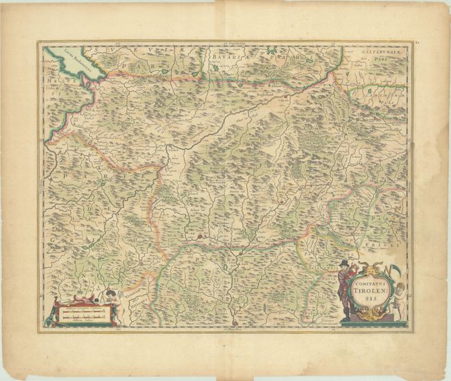This map focuses on the Tyrol region in western Austria and northern Italy, including the cities of Innsbruck, Trento, and Chur, and extends northwest to the Bodensee. The map is fully engraved with tiny towns, rivers, and three-dimensional mountains. The map is adorned with two strapwork cartouches. Blank verso, published between 1666-80.