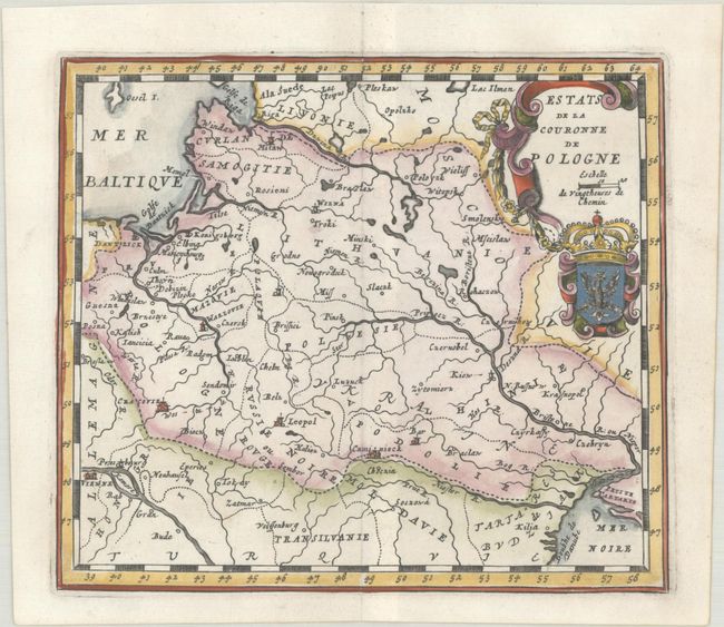 Small map covering the region of present-day Poland, Lithuania, Belarus and Ukraine. The decorative cartouche includes a coat of arms.
