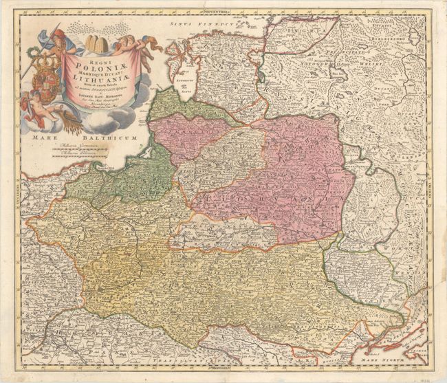 Homann's striking map covers Poland, Lithuania, Latvia, Estonia, and a portion of Russia, extending from St. Petersburg in the north to the Black Sea in the south. The map includes a lot of topographic detail and as well as the cities of Kiev, Minsk, Warsaw, and Vienna. A gorgeous allegorical cartouche fills the Baltic Sea and features Ares, god of war, holding both a spear and a laurel wreath; the Polish-Lithuanian coat of arms under Wettin dynasty; and beehives symbolizing industry.