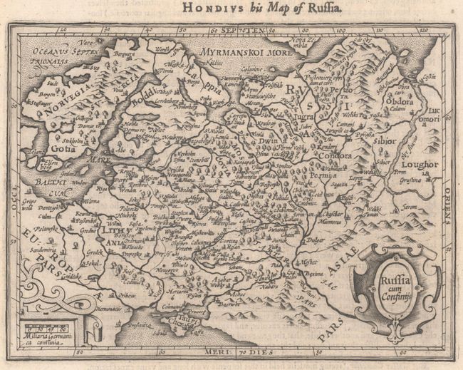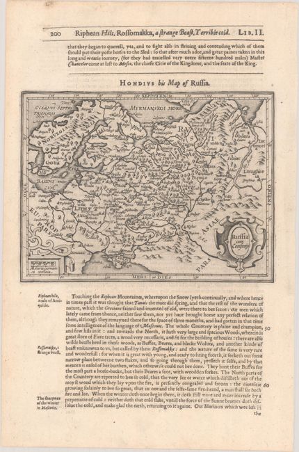 Charming small map of the Russian Empire in Eastern Europe. It covers the region from Scandinavia and Poland to the Ural Mountains. It has nicely detailed pictorial topography, including forests, towns, and mountains. The map is embellished with two strapwork cartouches. The map originally appeared in the Mercator/Hondius Atlas Minor and was used here by Purchas with the additional title above the map, "Hondius his Map of Russia." On a sheet of English text measuring 8.3 x 13.4".
