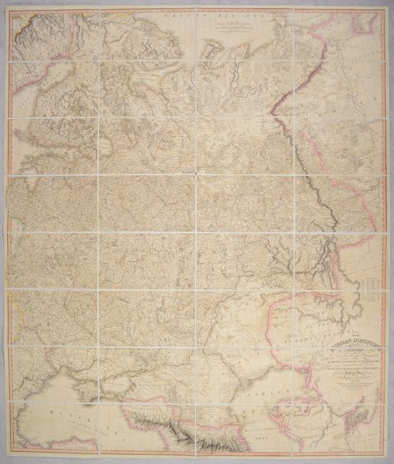A superb, large-scale map of what was then known as White Russia. The map extends from the Black and Caspian seas north through Ukraine and Russia up to Finland, the Arctic Sea coast, and parts of Siberia. It is filled with incredible detail including the post roads, ancient ruins and interesting notations. This map was compiled by Jasper Nantiat and based upon maps of the Academy of Sciences at St. Petersburg. This is the uncommon first state published by William Faden in 1808. Later editions published by James Wyld, successor to Faden, are more commonly found on the market. Dissected and backed with linen and self-folds into stiff marbled boards.