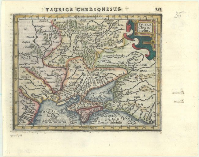 A lovely miniature map of the region north of the Black Sea encompassing the Crimea and the southern steppes of Ukraine. The map is adorned with a strapwork title cartouche at top right. Latin text on verso.