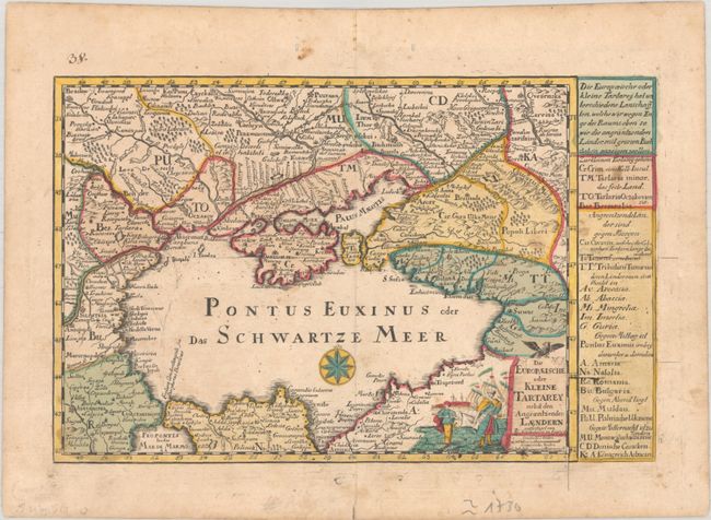 Attractive small map filled with an incredible amount of information of the region surrounding the Black Sea. The names of the regions are abbreviated and keyed to the panel at right. Embellished with a compass rose and a title cartouche featuring two soldiers and a ship. There is evidence of two short cracks in the panel at right.
