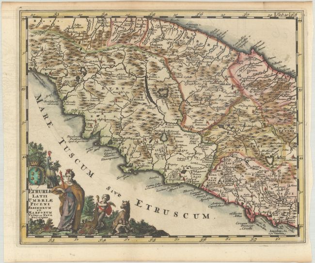This is an attractive map of central Italy, from Tuscany on the west coast to Umbria on the east coast. The map is centered approximately on Perugia and Lake Trasimeno, with numerous cities, rivers, mountains, and political boundaries shown in nice detail. It is adorned with an allegorical title cartouche depicting a queen, a peacock, a putto with a cornucopia, and Romulus and Remus suckling on the she-wolf.