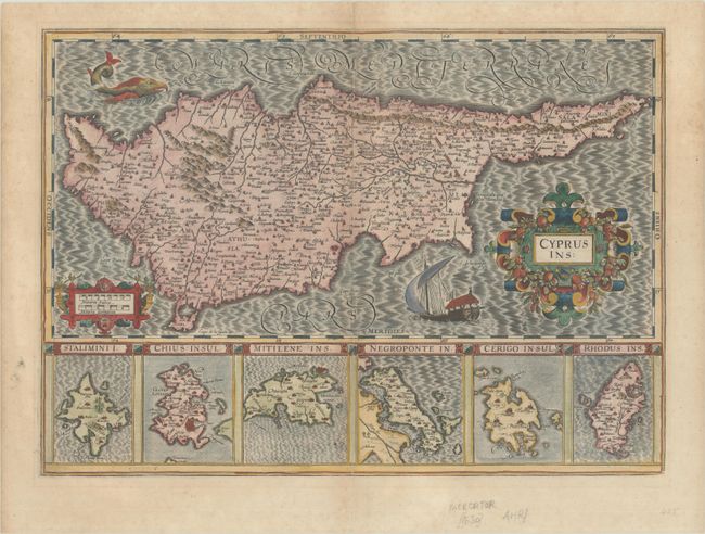 This superb map of the island of Cyprus is geographically based on the earlier work of Ortelius. This map was added to Mercator's Atlas by Hondius, as Mercator never published a map of Cyprus. Hondius changed the orientation from Ortelius' map, likely influenced by Ptolemy. The beautiful composition of the map makes it one of the most desirable maps of the island. At bottom are inset maps of five Greek islands: Lemnos, Chios, Lesbos, Evia, Kythira, and Rhodes. The map itself is handsomely adorned with a sea monster, a sailing ship, two strapwork cartouches, and a moire patterned sea. Latin text on verso.