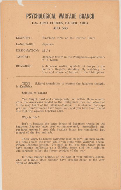 This well-preserved leaflet coded "22-J-1" was produced by the Psychological Warfare Branch of the U.S. Army. It was dropped by U.S. forces on Japanese troops in the Philippines, especially on Luzon. The illustration on the front of the leaflet depicts a Japanese solider watching idly as a fierce U.S. aerial attack takes place.