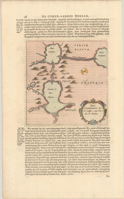 This interesting little map covers the region including the Black and Caspian Seas and the Persian Gulf with a system of underground canals connecting them.  The only city shown is Constantinople.  This is from Kircher's masterpiece, an immense and amazing work covering all aspects of anything that dwelled or occurred within the earth's interior - from dragons, to fossils, to mountain springs, earthquakes, and volcanoes.  Kircher's work was the first serious effort to describe the physical makeup of the earth, proposing theories (sometimes fantastic) in the areas of physics, geography, geology, and chemistry.  He suggested the existence of a vast network of underground springs and reservoirs, as well as the theory that subterranean temperatures increase directly in proportion to depth.  Published in a Dutch edition of Kircher's famous Subterranean World by Johann Waesberger.  On a full sheet of Dutch text measuring 9.4 x 15.3".