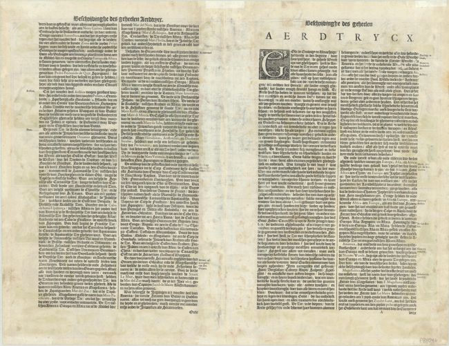 Petrus Plancius' world map of 1592 was the main source of geographical information. The map is shown on Mercator's projection with a massive Southern Continent attached to New Guinea, with the coastal names of Beach and Psittacorum regio noted from Marco Polo's travel memoirs. North America has the westward bulge characteristic of the time, with the Strait of Anian noted. Korea is shown as an island and Japan is in a kite-like shape. The map itself is richly decorated with cartouches, sea battles, monsters and compass roses. Geographically the map itself is also copied from Blaeu, but includes more legends and additions referring to explorations in the Arctic. A long note near the cartouche discusses the theory that the straits of Anian and Davis link to form a Northwest Passage. Kaerius also added rhumb lines radiating from compass roses arrayed across the equator. The map was first published in 1608. In 1621 Kaerius sold his plates to Jan Jansson who then issued the map with his imprint and the date. This example is the fourth state with Jansson's imprint added and the date removed. Dutch text on verso, published between 1637-44.