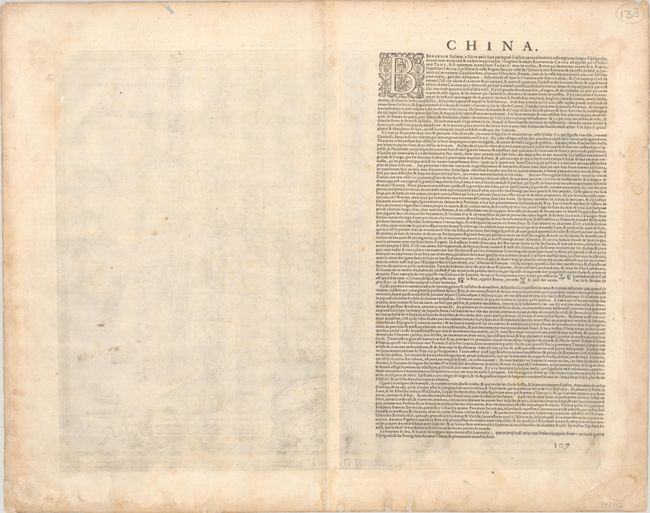 This landmark map provides a fascinating view of the mysterious orient from a Renaissance perspective. Ortelius based the map on the work of Jorge de Barbuda, a Portuguese Jesuit also known as Ludovicus Georgius, whose manuscript map reached Ortelius by way of Arias Montanus. The depiction, which became the standard image of China for over half a century, shows the legendary kingdom at an early point in European exploration of the region. The map is oriented with north to the right and extends into parts of Indo-China, the Philippines and part of Japan. The Great Wall is prominently delineated and several huge lakes and rivers dominate the topography. Two mythical lakes are included: Chiama Lacus (Lake Chiamay) with five rivers flowing south; and a larger lake simply labeled Lacus that is purported to be the source of the Yellow River. Illustrations in the interior include tent cities of the Tartars, stags, elephants and elaborate sail-powered carriages. The map is further adorned with three ornamental cartouches. This is the third state with las Philippinas added above Sinus Magnus and additional crosshatching on the wind wagons, published in the French edition of 1598.