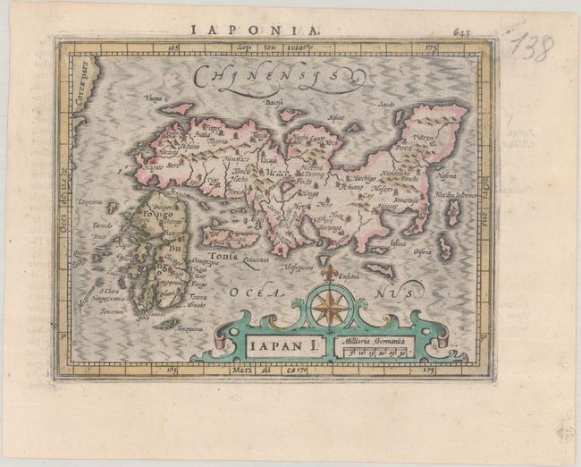 Superb small map derived from Hondius' folio map of Japan. It is based on the Ortelius/Teixeira type with Honshu, Kyushu, and Shikoku depicted with approximately the correct proportions. Meaco (Kyoto) is located in the center, and many other place names are noted. A deftly engraved strapwork title cartouche incorporates a compass rose. Latin text on verso.