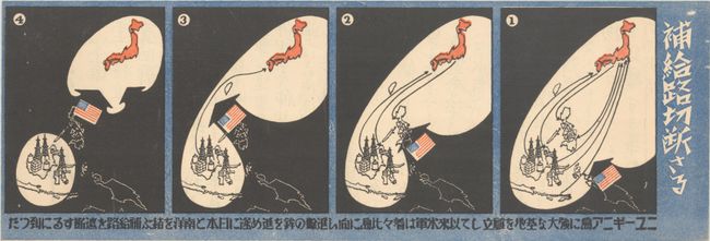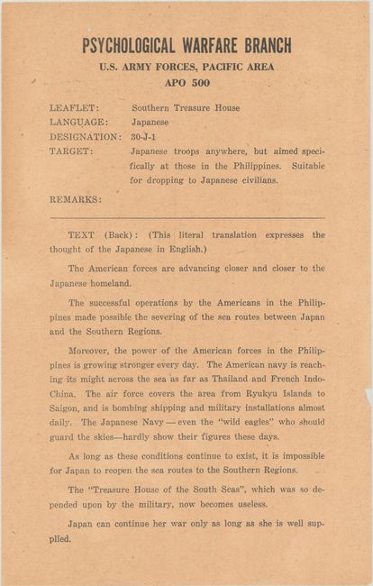 This well-preserved leaflet coded "30-J-1" was produced by the Psychological Warfare Branch of the U.S. Army. It was dropped by U.S. forces on Japanese troops in the Philippines, but was also "suitable for dropping to Japanese civilians." The illustration on the front of the leaflet shows the progression of American forces cutting off the supply routes between Japan and the Philippines.