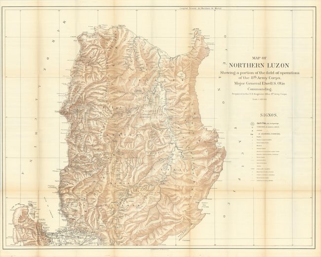 This large and exceptionally detailed map is one of the most remarkable maps produced during the Philippine–American War. It presents the field of operations under Major General Elwell Otis from Lingayen and Casiguran Sound to the northern coast of Luzon. The map presents detail of the topography, rivers, and place names with a legend at right identifying finer details including churches, forts, trails, cable lines, thermal springs, caves, and much more. Outside of the title, the map is entirely in Spanish. Lithographed by Andrew Graham in Washington.