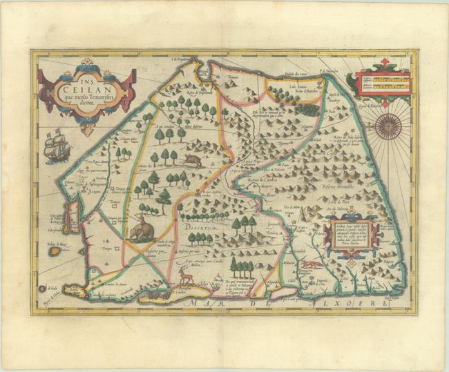 This exquisite, early map of Sri Lanka is shown with an unusual five-sided shape. North is oriented to the left by an elaborate compass rose. The map was beautifully engraved by Petrus Plancius with pictorial detail of mountains, roads, forests, villages, kingdoms, mines, stupas and spice plantations. This is the first plate, embellished with three strapwork cartouches, a finely rendered sailing ship, a compass rose, and animals roaming the interior (including a large elephant with his manhout). Latin text on verso.