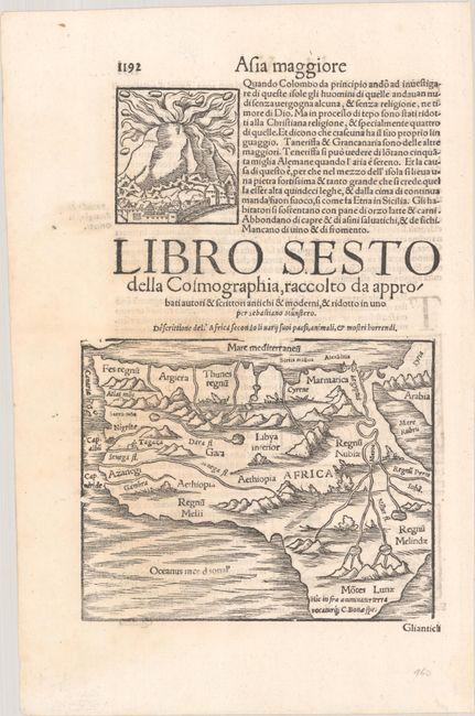 This small woodblock map of the continent excludes the Horn of Africa and the Cape of Good Hope. It concentrates on the many kingdoms of Central and North Africa and depicts the Nile's origins in twin lakes located near the Motes Lunae. Above the map is an image of a volcano erupting, and on the recto are images of a vineyard and a hunting dog. On a full sheet of Italian text measuring 8.3 x 12.6".