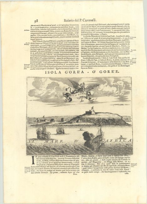 This view depicts Goree Island, located just south of Dakar, Senegal. Several buildings and fortifications can be seen on the island, and galleons engaging in battle fill the surrounding waters. The ribbon-style title cartouche is held aloft by a griffin. On a sheet of Italian text measuring 13.9 x 19.6".