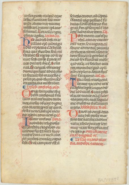 This vellum leaf is from Spain or Italy and is written in Latin in two columns with a number of initials in red and blue penwork that extends into the margins. The text relates to Maximian Augustus and Diocletian, co-emperors of Rome from 286 to 305.