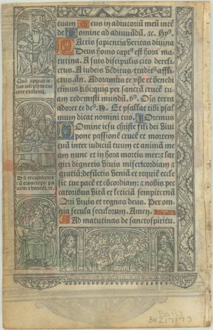 This vellum leaf is from a printed Book of Hours. It is a beautiful example of early printing with the recto featuring a full-page, hand-colored image of Jesus Christ carrying the cross on his way to the crucifixion. Below the image is Psalm 50:17, which translates as: "O Lord, you will open my lips, and my mouth will announce your praise." The verso includes additional iron engravings that depict biblical scenes.