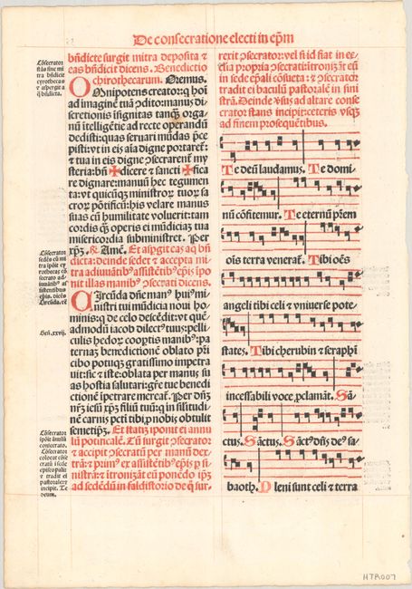 This superb leaf comes from an Italian pontifical, a type of liturgical book with instructions for rites and ceremonies specifically performed by bishops. It is printed in red and black ink, in two columns and includes a hymn of four-line music and a woodblock illustration of a blessing ceremony. Patriarch Luc Antonio, called the Coryphaeur, or leader of printers, founded the highly regarded printing house of Giunta in 1482. After his death in 1537, the business was carried on by his descendants in Italy, France, and Spain, well into the 17th century.