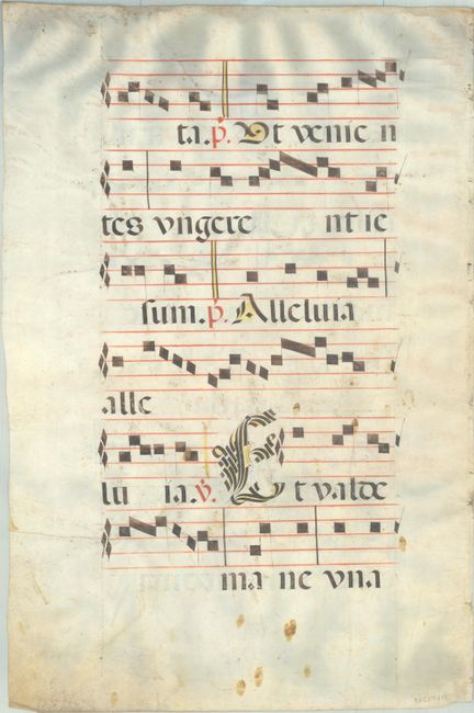 This impressive elephant folio sheet of vellum contains five-line music in red and black ink with one large initial in intricate red and blue pen work. The song includes the beginning of Mark 16, in which Jesus has risen, and translates as:
