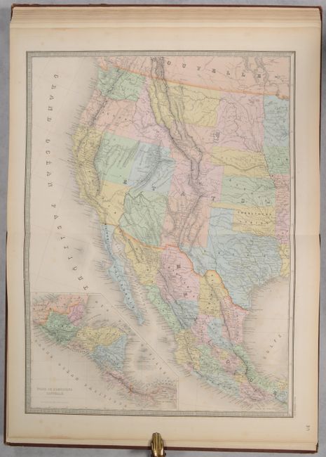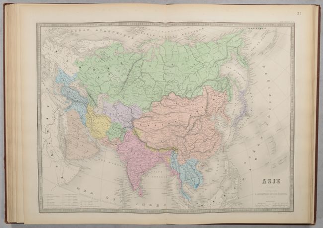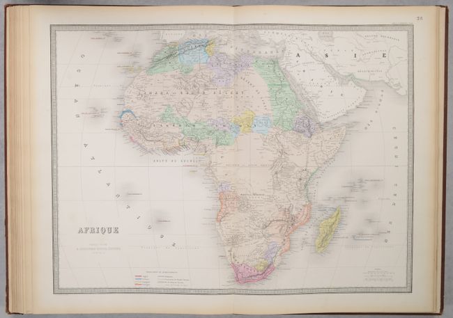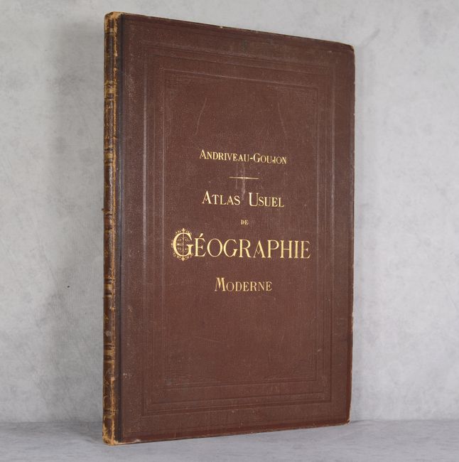 This tall modern atlas has 30 (of 32) maps, including maps of the world (1), Europe (17), Asia (4), Oceania (1), Africa (3), North America (3), and South America (1).  The maps of central and southeastern France are missing.  The world map focuses on modern lines of communication, identifying different telegraph lines and routes of cruise ships.  The 2-sheet Carte Generale des Etats-Unis et du Mexique Comprenant l'Amerique Centrale et les Antilles is dated 1868 and depicts Dacotah Territory and Territoire Indien.  The map of North America, Amerique du Nord, identifies the European possessions of the British, French, Spanish, Danish, Dutch and Swedish.  The maps are dated between 1864-1869.  Elephant folio.  Hardbound in brown quarter leather over brown pebbled cloth boards with gilt title on front cover and spine.