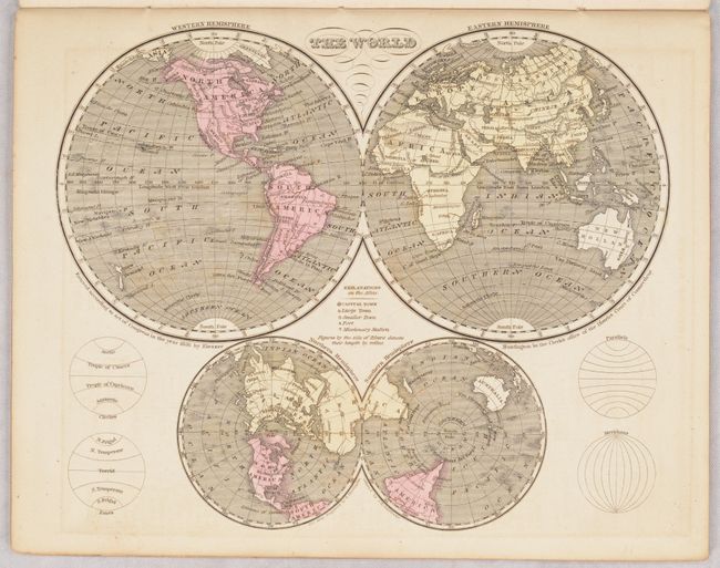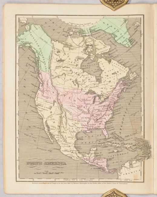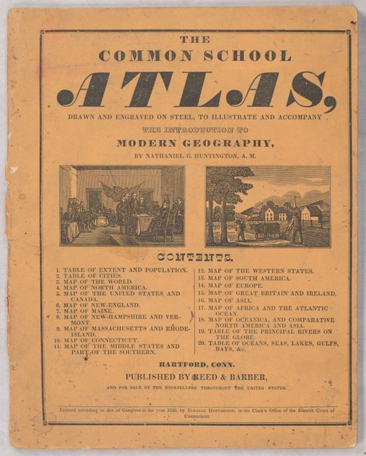 This is a nice example of this uncommon atlas that was used in conjunction with Huntington's Modern Geography.  Published by Reed & Barber, it contains sixteen single-page steel engraved maps, all with contemporary hand coloring.  The map of the United States features the Independent Republic of Texas.  It further locates Houston, San Felipe, S. Antonio, Viesca, and more.  Above Texas, the large Missouri Territory extends to Wisconsin Territory, which includes most of the northern Midwest.  The map of North America presents the northwestern boundary with Canada well into present-day British Columbia, reflecting U.S. interests in the region.  Tables include population, cities, principal rivers, and bodies of water.  All maps with blank versos.  20 pages.  The burnt umber paper covers contain the title on front and advertisements on back for other Reed & Barber publications.