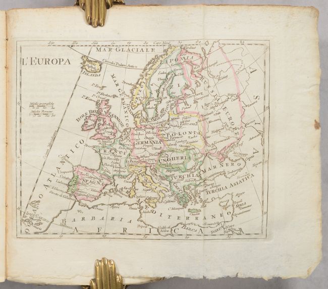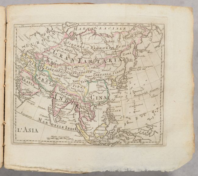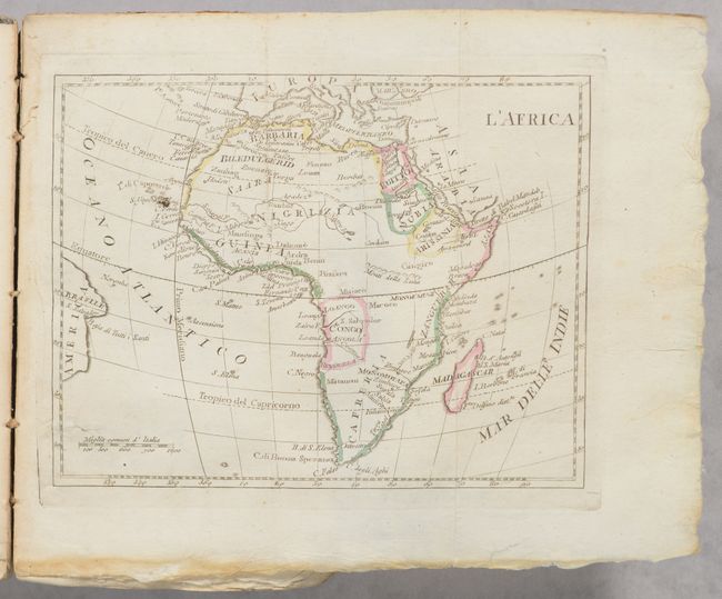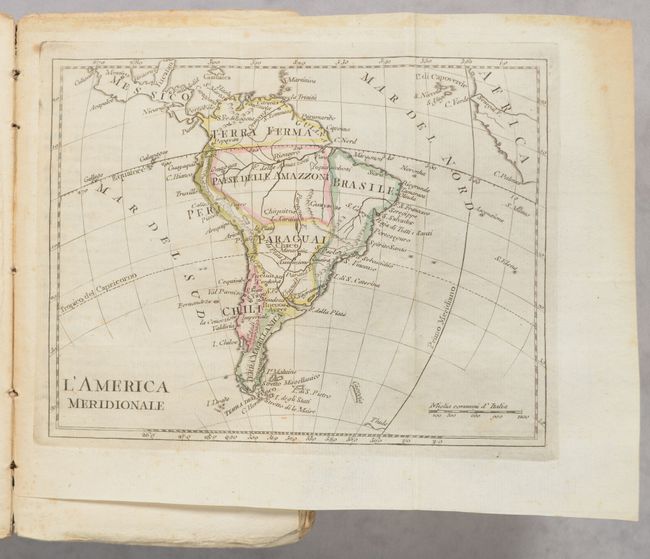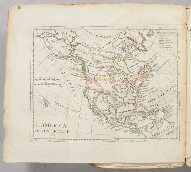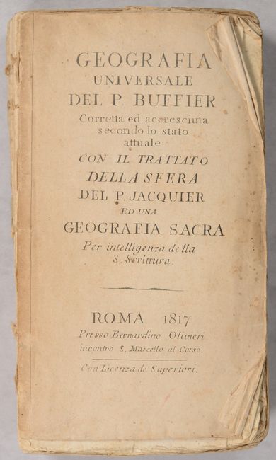 This is an Italian edition of Buffier's geography book first published in 1715.  It contains 17 plates including the world, 5 continents, 10 regional maps of Europe, and an armillary sphere.  The title page is dated 1817, but the map of North America is dated 1822.  It shows the U.S. extending to the Pacific Ocean and the northern boundary with Canada is along the Columbia River, favoring a British viewpoint of the border.  Mexico is in control of the Southwest, and Alaska is taking shape.  Colonial possessions are color-coded.  The volume also features an attractive double-hemisphere world map.  The text is written in a unique "question and answer" format.  408 pages.  Paper wrappers.
