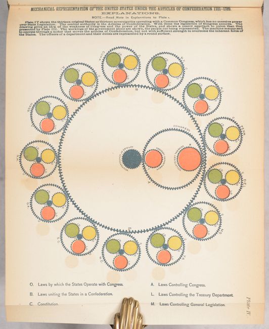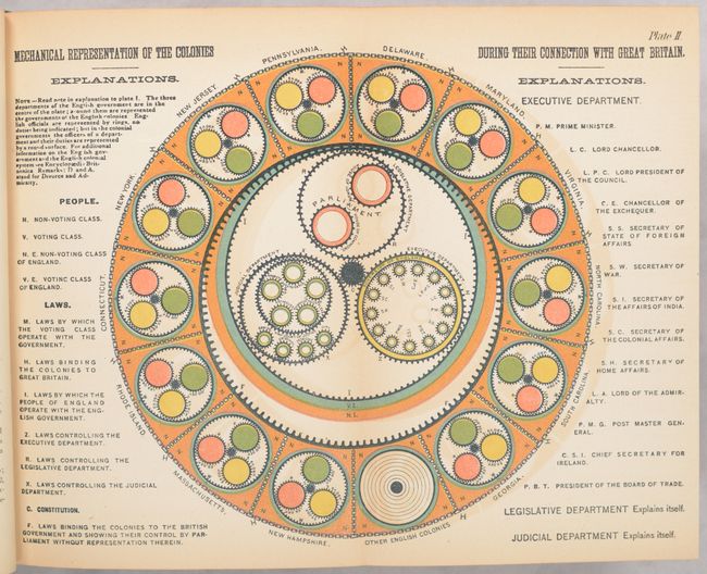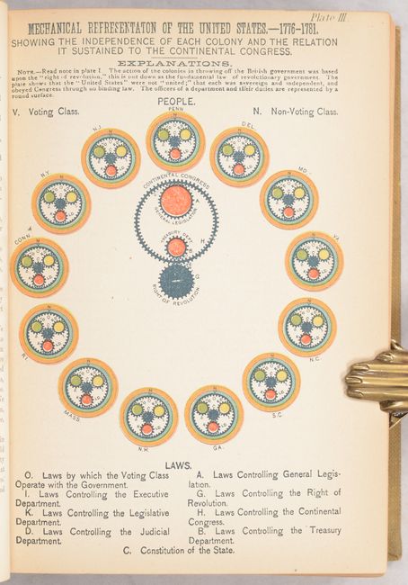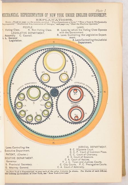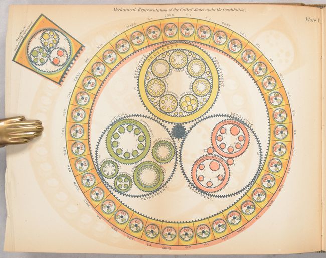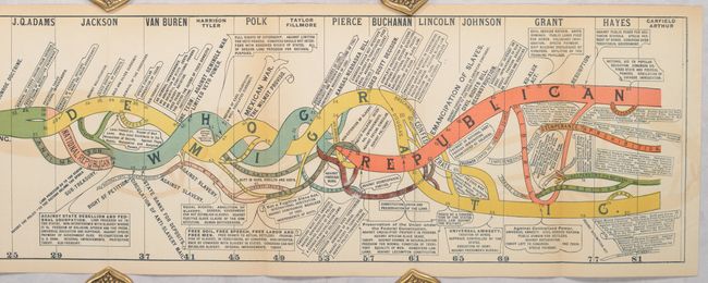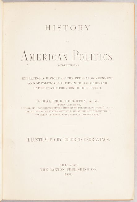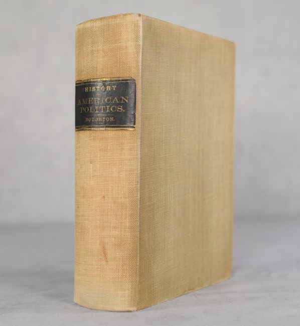 Walter R. Houghton's overview of American politics includes chapters on each stage of political change in the United States from colonial times to 1884, as well as chapters on each of the US presidents through the beginning of Chester A. Arthur's term.  The book features six full-color plates depicting various times in US politics, ending with a long folding plate, Diagram of the History of Political Parties in the United States (35.1 x  6.9").  This plate presents a timeline of US politics from 1735-1881 highlighting various political parties and important events that shaped the course of the United States.  This book is quite uncommon, particularly with the long folding plate still intact, and we found only two examples offered at auction in the last 20 years.  Octavo; 550 pp. with 2 single-page plates and 4 folding plates.  Hardbound in tan cloth with black leather label with gilt title on spine.