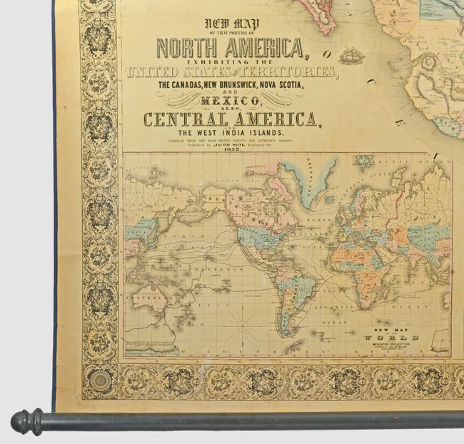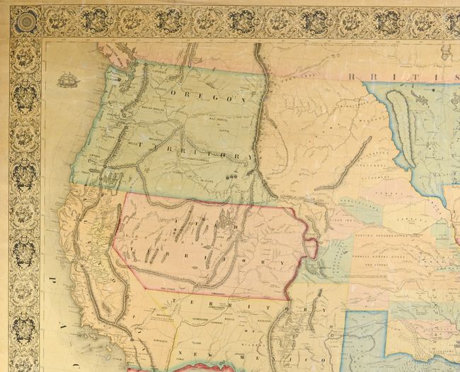 This majestic wall map was published just as the country was beginning to expand fully to the Pacific following the land gains after the Mexican War. The gold region in California is remarkably inaccurate with Auburn shown well north of Sacramento City and lying between it and the Marysville/Yuba City area. The Great Basin area is also inaccurate and roughly follows the Fremont model. The middle of the country is occupied by the newly organized Kanzas Territory and Nebraska Territory, which stretches from the Missouri River to the Continental Divide. The map features very large, early configurations of Washington, Oregon, Utah and New Mexico territories, and Indian Territory is composed of three named areas: Chah-Lahkee, Moscogee and Chahta. This edition also depicts the boundary line of the proposed Gadsden Purchase in present-day southern Arizona. The map is filled with wagon routes, explorer's trails, forts, Native American tribes, and much more. Surrounding the main map image is a table of distances, a table of United States counties, and a large inset of the world on Mercator's projection. This spectacular wall map is embellished with decorative borders and numerous engraved sailing ships and steamships in the oceans. Printed and published by Hoen & Company, Baltimore. Original linen backing and rollers present and intact.