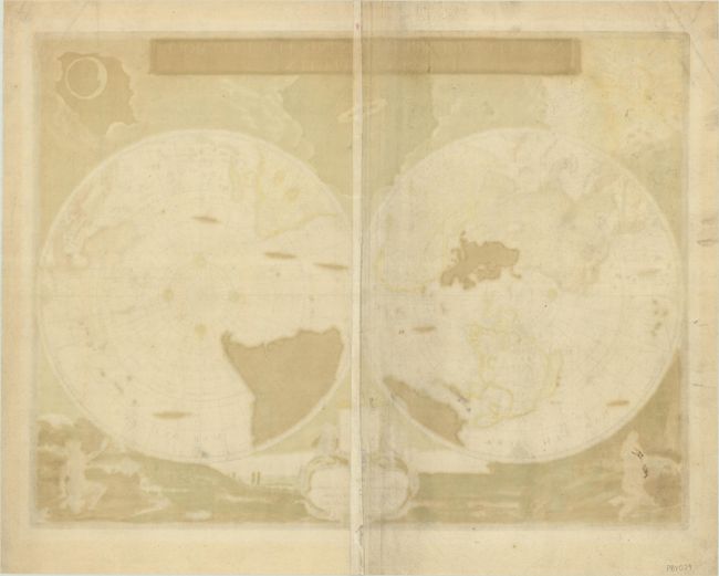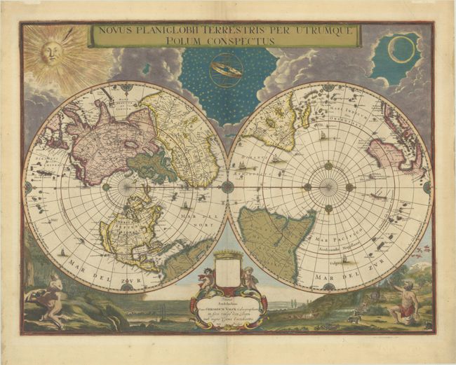 This uncommon, beautifully engraved map showing the world on a polar projection was the final world map executed by Johannes Blaeu in circa 1672. A tragic fire destroyed the Blaeu company that same year before the map was published. The plate itself survived and was acquired by Gerard Valck, who replaced Blaeu's imprint with his own. Traces of the original imprint can still be discerned in the cartouche. The map shows California as an island; the only Blaeu map to depict this cartographic myth. In the Pacific, the coastline of Australia is beginning to take shape. In South America, two mythical lakes are shown: Parime Lacus is on the Equator and Lago de los Xarayes appears in the center of the continent. The southern tip of South America is oddly truncated due to the projection. Surrounding the map are billowing clouds, the sun, moon and an armillary sphere at top. The bottom of the map shows Eve emerging from the rib of Adam on the left, and on the right, a clothed and ashamed Adam is about to depart the Garden of Eden.