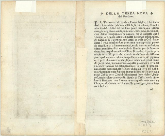 This important early map was the first map devoted to the East Coast of North America, and the first largely devoted to Canada. The map extends from Labrador south to Florida, and as far east as the Azores. This was one of the first maps of the area to show detail, based primarily on the expeditions of John Cabot (1497-98), Giovanni da Verrazzano (1524), and Jacques Cartier (1535-36). Gastaldi was known to use the most current geographical information available, and made use of numerous sources, including the manuscript maps from Verrazzano, Maggiolo, Cabot and others.