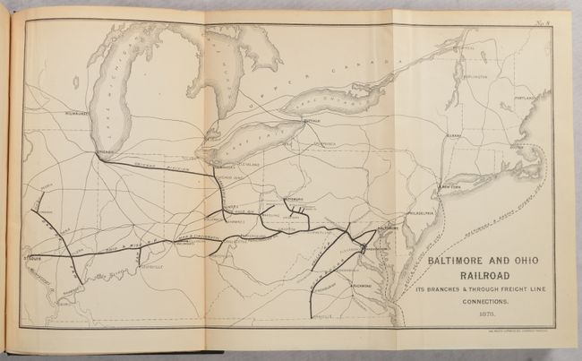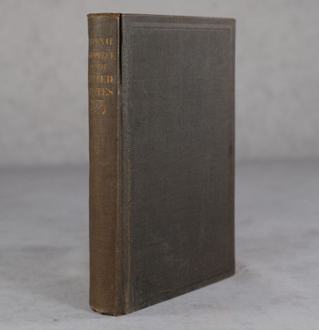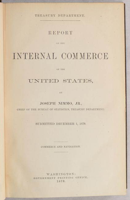 This is Joseph Nimmo’s first report on commerce within the United States. Nimmo was Chief of the Bureau of Statistics in the Treasury Department and responsible for a number of important reports regarding railroads and the cattle industry. A large section of the report deals with “The Relations of the Railroads to the Public Interest,” topics he describes as ‘the railroad problem.’ Nimmo states “the main object…has been to describe the evils which have sprung up in the course of the development of the railroad system, and the measures which have been proposed or adopted for the correction of such evils.” Nimmo concluded by recommending more governmental regulation. A large appendix contains reports of experts. Accompanying the report are 8 folding maps including The Principal Transportation Lines West of Chicago, St. Louis & New Orleans (23.2 x 20.3”) and The Principal Transportation Lines Extending West from Boston, New York, Philadelphia, and Baltimore (22.7 x 16.0”) in color, along with 6 smaller black & white maps showing other U.S. regions. 250 pages. Hardbound in brown cloth with gilt title on the spine.