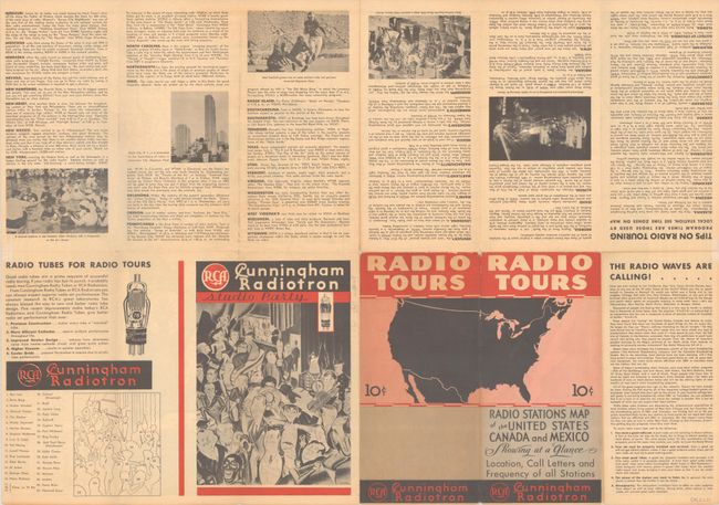 This map encourages touring the United States by experiencing radio stations around the country. Radio stations are identified on the map, which is surrounded by two extensive indexes listing the stations by call letter and by kilocycle, and indicating their location and power in watts. The cartouche in the Gulf of Mexico explains how to test the performance of the viewer's radio using a "performance yardstick" that is not included with this example. On verso is text highlighting the radio scene state by state and a keyed illustration showing a Cunningham Radiotron "Studio Party" with caricatures of various radio characters and personalities, including Betty Boop, Walter Winchell, the Shadow, Al Jolson, Bing Crosby, George Burns, Gracie Allen, and more. Self-folding (4.5 x 9.2") into pictorial wrappers. Published by Hagstrom Company, Inc for RCA Radiotron Co.