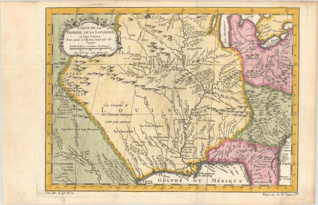 This finely engraved French and Indian War period map of French Louisiana is based on a map by Delisle. It covers from the Great Lakes to the Gulf of Mexico, extending to show Nouveau Mexique in the west and about half of Florida in the southeast. The Mississippi River flows dramatically down the center of the map with tributaries including l'Oyo ou la Belle Riviere (the Ohio River), Missouri River, and the Riviere de Moingona in the area of modern-day Des Moines. The map is filled with place names including many Indian tribes, missions, forts, and early settlements. Nouveau Mexique in the far west includes Santa Fe and names the S. Jerome de Taos. Adorned with a rococo-style title cartouche with a distance scale.
