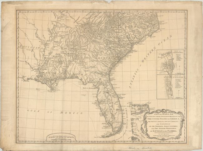 This is a later edition of this important map that was first published in 1776 in a British military atlas. It was based on the work of De Brahm, Collet, Mouzon and the important hydrographical surveys of the coast of Florida and the Bahamas by Bernard Romans. The map appears to be identical to the 1794 edition and has not been updated to reflect development in the trans-Appalachian West. Louisiana (1803) and Florida (1819) are still spelled out in the title as "Spanish Possessions." Florida is still shown divided into East & West with a spine of mountains, labeled the Great Sandy Ridge, extending down the center of the peninsula. The map is filled with information concerning Indian Nations, with numerous trails, roads and villages located. It includes inset plans of St. Augustine and Charleston above the decorative title cartouche.