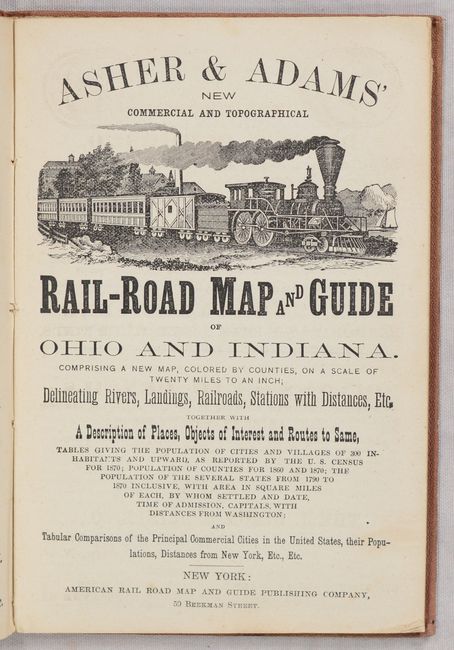 This is the rare pocket map version of Asher & Adams atlas map that is printed on thin, banknote-style paper. It is colored by county and shows the robust railroad network along with cities and towns, rivers, and more. The map extends to include portions of Pennsylvania, West Virginia, Kentucky, Illinois and Michigan. Includes a railroad guide and numerous advertisements intended for the tourist and traveler. Folds into maroon cloth boards with gilt title on the front cover.