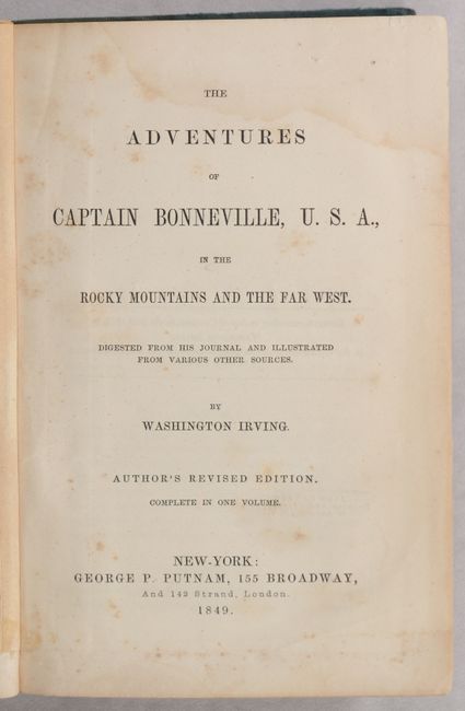 The map is still bound in the original "The Adventures of Captain Bonneville, U.S.A., in the Rocky Mountains and the Far West" (5.3 x 7.5"). Published complete in one volume, this is the 1849 "Author's Revised Edition" of Irving's popular works that provides a historical account of Bonneville's three year exploration of the Rocky Mountains. Bonneville did not submit any reports to his superiors in Washington during his hiatus, thus causing the U.S. Army to declare him "virtually deceased," and subsequently removed from the military roster. 428 pp. Hardbound in green cloth with gilt title on spine and heavy embossed design on covers. A historical and desirable map complete in the original volume.