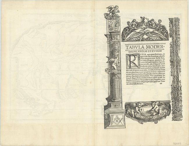 This is one of two 'modern' world maps included in Fries' Ptolemaic atlas and one of the few early 16th century world maps available to collectors. It is a reduced version of Waldseemuller's famous Admiral's Map, concentrating on the Old World but showing parts of America at the left side. It shows the world in a combination of classical misconceptions with a few of the more recent discoveries, such as a bit of the coastline of South America along the left border. Greenland is drawn as an elongated peninsula connected to a still primitively shaped Scandinavia. Fries' adaptation presents the mountains in a different stylized manner and lacks the directional lines of the Waldseemuler plate. Decorative elements have been added including an elephant just off the coast of Greenland and portraits of five kings: Russia, Egypt, Ethiopia, Toprobana and Mursuli. It provides a fascinating view of what was known, and not known, of the world at the beginning of the Age of Discovery. The upper right corner of the border is lacking, as is the case with editions from 1525 to 1541. Latin text and elaborate woodblock engravings on verso.