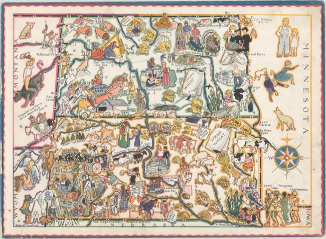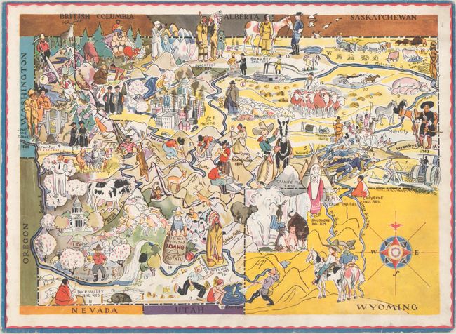 This lot features three pictorial maps from Berta and Elmer Hader's Picture Book of the States. States represented on these regional maps include the Dakotas, Montana, Idaho, Nevada and Utah. Each is fully illustrated in a fanciful and quaint style, identifying important buildings, agriculture, natural features, and much more. There is text on the verso of each map that relates to the adjacent map when viewed in a book. Photocopies of the text corresponding to these three maps are included for reference.