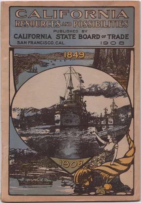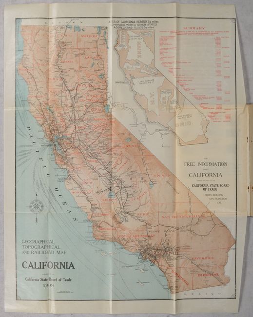 A detailed map of the state that is delineated by county and presents the railroad network and shipping routes. Relief is presented with an attractive three-dimensional effect. An unusual large inset map visually demonstrates how 10 other states would easily fit within California's footprint, and a table to its right presents the state's economic output. The map is located at the rear of the Board of Trade's 18th Annual Report, which includes a letter to members, population statistics, rebuilding in San Francisco (due to the 1906 earthquake), various notes and tables regarding agriculture and forestry, climate, education, and more. Pictorial paper wrappers (6.8 x 10").