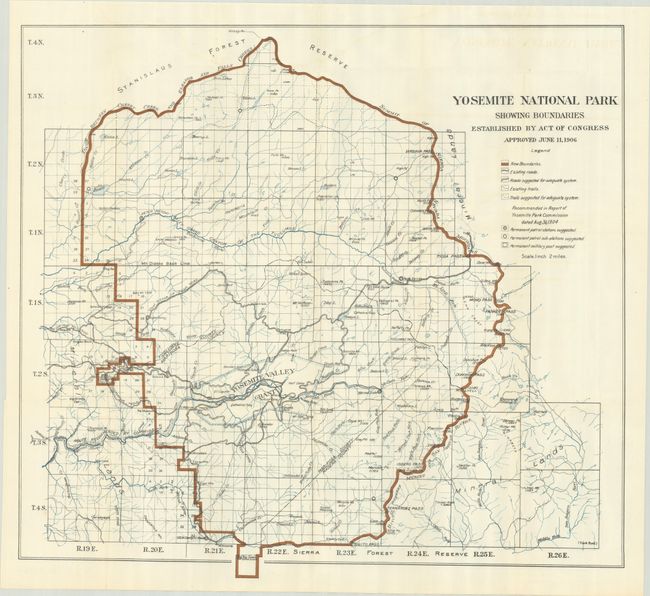 A. Yosemite National Park Showing Boundaries Established by Act of Congress Approved June 11, 1906, by U.S. Government, dated 1906, printed color (27.1 x 24.8"). This colorful map illustrates the new boundaries of Yosemite National Park with the incorporation of the Yosemite Valley Grant near the middle of the park and the Big Tree Grant at bottom. It contains considerable detail on a scale of 2 miles to the inch. A legend provides an explanation of symbols including existing and suggested trails, roads, and patrol stations.
