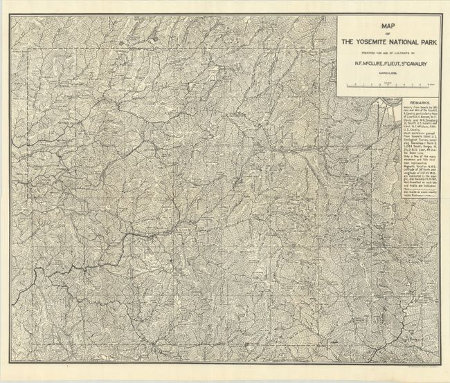 B. Map of the Yosemite National Park Prepared for Use of U.S. Troops by N.F. McClure, 1st Lieut., 5th Cavalry, by U.S. Army, dated 1896, black & white (20.0 x 16.4"). This very detailed and important map was made shortly after the establishment of Yosemite as a protected park in 1890. During this period, the Army's Fifth Cavalry Regiment controlled the park, and this map was made for their use. The map is filled with information on trails, cabins, camps and meticulous notes on topography. Prepared by N.F. McClure, 1st Lieut., 5th Cavalry.