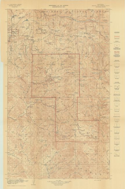This intricate map shows Sequoia National Park, the nation's second national park, established in 1890, and General Grant National Park (now Kings Canyon National Park). Contour lines are in brown with park boundaries in red. The legend canals and ditches, springs, roads and buildings, churches and school houses, trails, railroads, telephone lines, bridges, reservation lines, triangulation stations, bench marks, and more. Surveyed in 1902-03; geographers and topographers are credited at bottom left.
