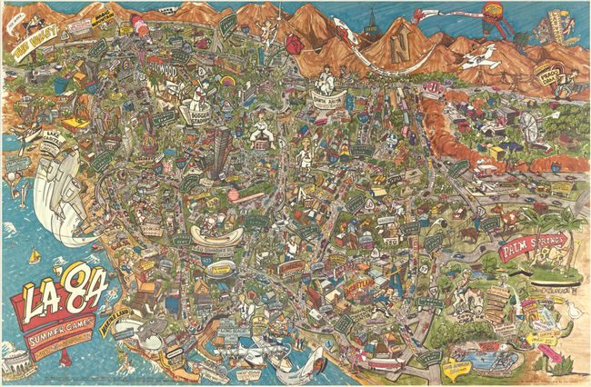 This lively pictorial map celebrating the 1984 Los Angeles Olympic Games was drawn by David Andrade, published by West Coast Ventures and printed by Scott & Scott. It covers the region from the San Fernando Valley (Fer Surr!) south to Newport Beach and east to the Inland Empire, and is absolutely teeming with illustrations that celebrate both the city and the games. Local attractions include Marine Land, Disneyland, Knotts Berry Farm, Hollywood, Magic Mountain, the Rose Bowl, along with numerous businesses who likely sponsored the map. Various Olympic sport sites are noted by athletes donning red, white and blue uniforms including a baseball player at Dodger Stadium, volleyball player at Long Beach, horseback riding at Santa Anita, and a cyclist (on a tricycle) at the velodrome. Traffic jams appear on almost all highways while a jet blasts off from LAX appearing to begin a loop-de-loop. The floating title cartouche sits atop a buoy east of Catalina Island. According to the copyright notice, this is the second edition of the map.