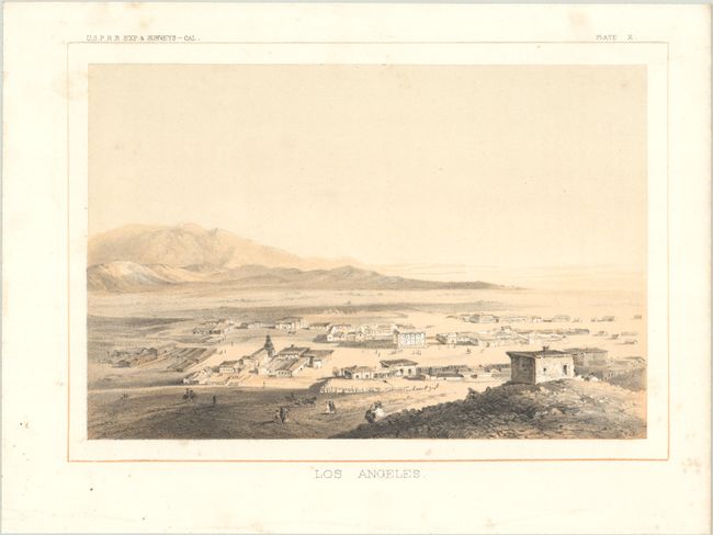 A. Los Angeles.This is the first printed depiction of Los Angeles. The plaza is on the left with the San Gabriel Mountains in the background. At the right foreground on the hill is the former Mexican jail. Our Lady of the Angels church is at center.