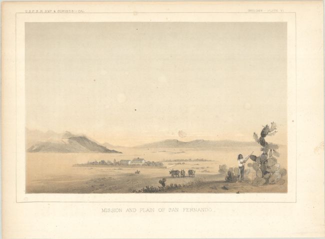 B. Mission and Plain of San Fernando.This is the first depiction of the San Fernando Valley, the now urban northwest area of Los Angeles. This lovely scene shows the walled mission in left center, a rider on a horse, some cattle, and a native harvesting prickly pear fruit in the foreground. The San Gabriel Mountains are shown in the background.