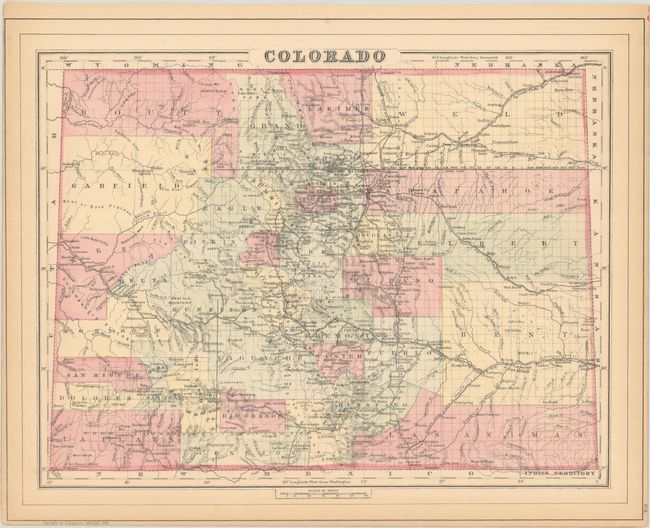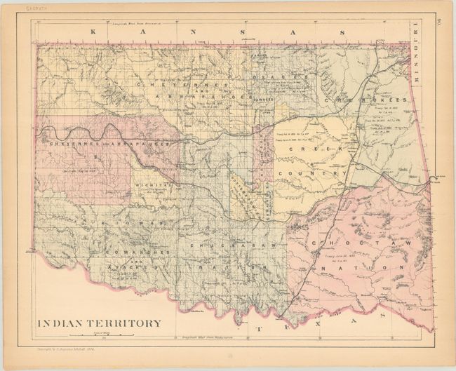 This detailed map shows the status of settlement and development eight years after Colorado became a state. It presents railroads, cities, towns and mining communities, watershed, forts, and more. What was once the large Confederate Ute Indian Reservation in the west is replaced by the counties of Garfiled, Mesa, Delta, and Montrose. Features good topographical detail via hachure. This is one of the few Mitchell atlas map years showing Colorado separately. Includes a map of Indian Territory on verso.