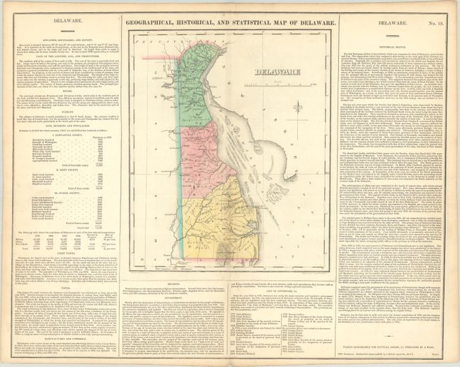 This map was drawn by Fielding Lucas and engraved by the firm of Young & Delleker. It shows the state with a population of less than 73,000 including 4,500 slaves and 13,000 "Free Blacks." In Delaware Bay numerous shoals along with the "Main Ship Channel" are depicted winding its way through the hazards. There is a modest network of wagon roads with towns and settlements including George Town, Louisville, Dover, and Wilmington. The map is on a full folio sheet (21.9 x 17.5") surrounded by English text giving a brief description of the state’s boundaries, rivers, climate, chief towns, government, and history.