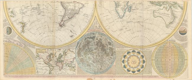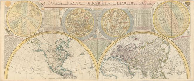 This fabulous, large map is one of the most attractive wall maps from the end of the 18th century. The huge double-hemisphere map of the world is surrounded by celestial hemispheres, a chart of the solar system, an inset world map on Mercator's projection, a map of the moon's surface after Father Riccioli, and a fascinating explanation of the Vicissitude of Seasons (with a great graphic of the sun). The large world map shows the tracks and discoveries of major voyages, including those of Captains George Anson, Louis Antoine de Bougainville, Lazier Bouvet, Aleksei Chirikov, and James Cook. The map was first issued in 1772 by Robert Sayer with the title Scientia Terrarum et Coelorum: or, the Heavens and Earth Astronomically and Geographically Delineated and Display'd... and was updated and reissued several times over a 30-year period. There were further issues by Sayer with the same title in 1781 and 1784, and the title was then updated to A General Map of the World, or Terraqueous Globe for the 1787 issue.